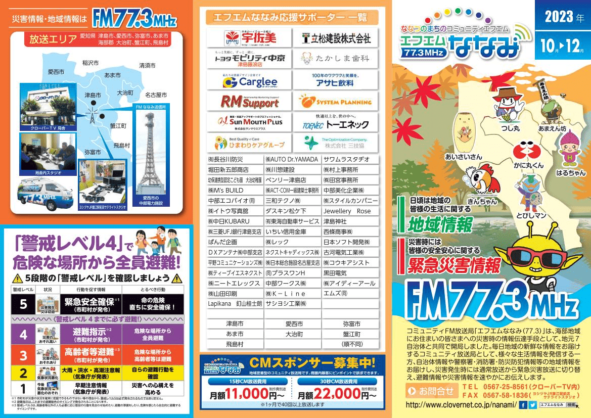 FM 電波受信可能エリア:津島市・愛西市・弥富市・あま市・大治町・蟹江町・飛島村および近隣(稲沢・清須・ 名古屋市内)。