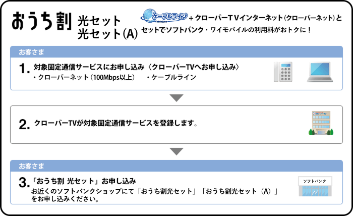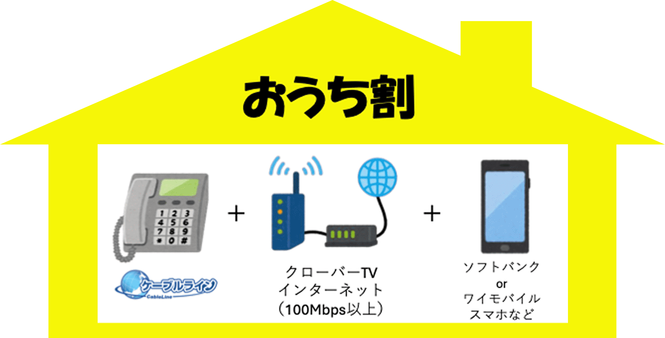 「おうち割光セット」は、当社指定の固定通信サーピスとiPhone 、ソフトバンク スマートフォン、ソフトバンク 携帯電話、iPad (4G LTE 対応のもの に限ります)タブレット、モバイルWi-Fi ルーター(以下「割引回線」)をセットでご利用いただいた場合に適用されるキャンペーンです。